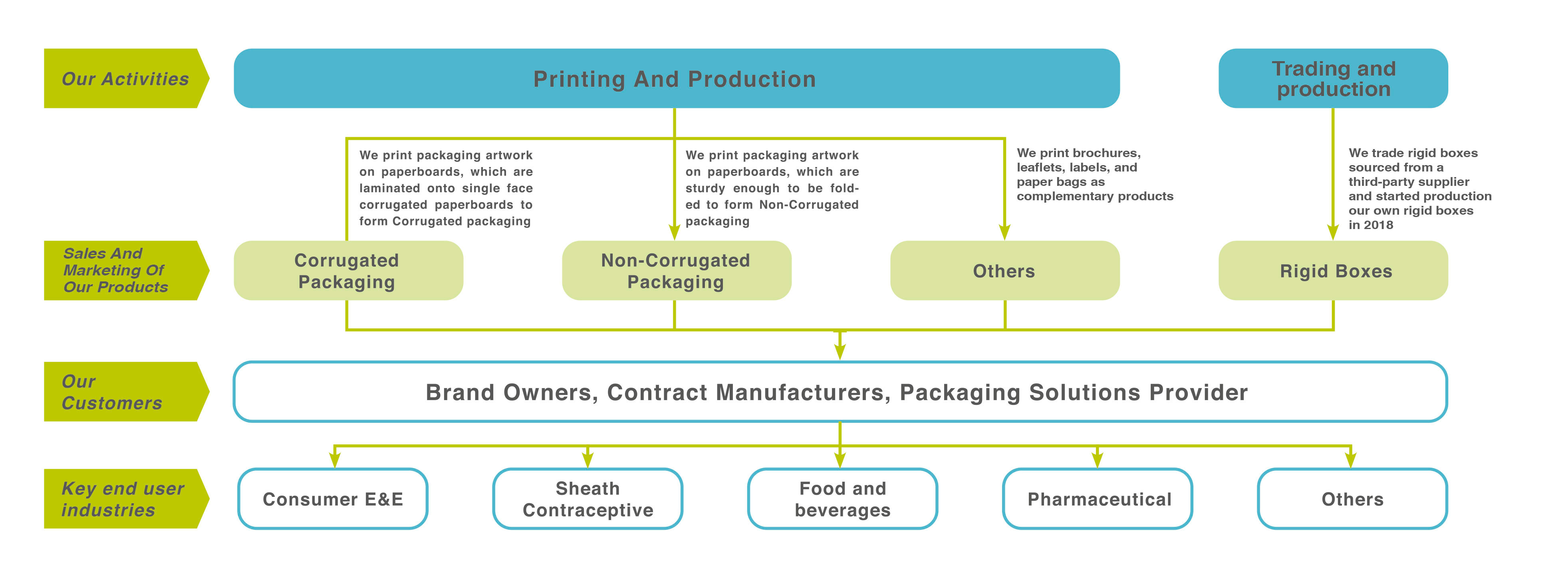 Our principal activity is investment holding. Through our subsidiaries, we are principally involved in the printing and production as well as sales and marketing of paper-based packaging, both Corrugated and Non-corrugated, and trading and production of rigid boxes. Our paper-based packaging is printed with full colour offset printing technology.